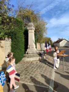 Les P’tiots de la ViMaVou (Viévy-Magnien-Voudenay) étaient nombreux à célébrer la commémoration du 11 novembre dans leur commune respective. En ouverture de la cérémonie, les enfants du RPI ont offert des bleuets de France qu’ils avaient fabriqués avec leurs maîtresses. Après avoir chanté la Marseillaise, fait l’appel aux morts, les maternelles, aidés par un adulte, ont récité un poème de Guillaume Apollinaire puis ce fut au tour des cp-ce1 de lire « Liberté » de Paul Eluard. Pour finir, les Ce2 Cm ont lu des extraits de courrier. La maman de Maé, 4 ans, raconte « J’étais très émue de voir mon enfant réciter au micro un poème sur la 1ère guerre mondiale. »